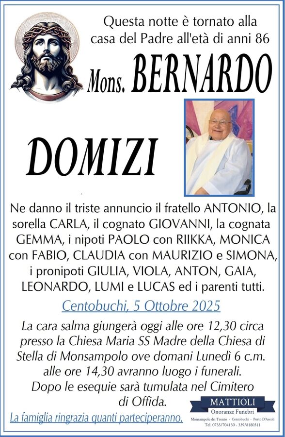 Oggi 5 Ottobre 2025 il Signore ha chiamato a sé il nostro caro Don Bernardo Domizi, parroco della nostra comunità per una vita intera.